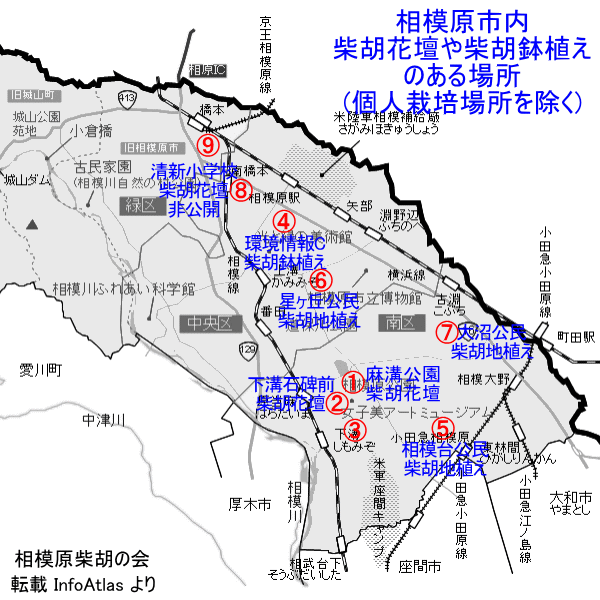 | ②相模原と紫胡 江戸の植物といえば「江戸むらさき」即ち武蔵野の広野に生える「むらさき草」であり、これは古来あまりに有名である。江戸名物、武蔵野名物むらさき草といえば「花はどんなであるか」「美しい草か」とすぐに質問が来るが、相模原の人達からも「花の美しさ」や「姿の美しさ」を質問される。 私は云う「名前の方が先き走ってしまって花や姿もそれにふさわしいものと思うでしょうが、本物は極めて平凡な姿です」と。 「かまくらさいこ」は「解熱剤」として利用されたようで、根部を主として使用した。古い俳句に「村雨を背中に受けて紫胡掘り」というのがあるというが、これはどこで紫胡の掘り取りをやって居る情景を読んだものか知らないが、昔は相模野でも盛んに紫胡掘りをやったらしい。相模原市史編集が始まった折、市内で史料編集をやったら、麻溝地区の掘之内部落辺から「紫胡掘り」に利用した道具が発見された。土地の人は「せいこ掘り」と称しているが丁度柄付の「山芋掘り」の道具の様な形である。 こんな相模原と伺縁浅からぬ「さいこ」であるが近頃相模原市もすっかり平地林や山林が開発されてしまって、住宅も建て込んで来てしまったので、もう容易に「紫胡」の姿を見つけることは出来ない。市民の中でも、この植物の姿を知る人は少ないのである。 相模原の柴胡始末記表紙.jpg) | 相模原の柴胡始末記P4.jpg) | | 多摩の自然(第21号) | ③さいこ探し読売新聞の「相模の動植物」が話題として取りあげて来始めると「君さいこを採った事があるか」とか「標本を見たいが」「相模原のどこへ行ったらとれるか」と小生の顔を見ると聞いてくる人もあった。 始めのうちは「何のために」たずねるのか知らなかったが、後になると市役所首脳部の方々がこの植物を探し出すのに骨折っているのだということを知った。そんな質問に小生は答えた「相模原中を探したら或は有るかも知れない、また無いかも知れない。今すぐ出かけて行ってすぐ見つかるかも知れない。あるいは三日探しても四日探しても見つからぬかも知れない。私も近頃は相模原中を採集して歩かないので、しばらく留守していたので保証することは出来ない。 かつてここいら近辺を歩いて採集した植物標本は全部相原高校生物標本室に置いて来てしまった。それにそれは「古くなって虫がくってしまったでしょう」とどうも冷淡な回答だがこうするより外なかった。 もう相模原市内に残る山林を歩いても「かまくらさいこ」の姿を見つけることは出来まい。昭和三十年頃まだ橋本の山林の中に大砲弾なぞがすててあって終戦の姿が残っていた頃その山林内で植物採集をした時「まるばさいこ」の株を見つけた事があってそれを根掘りして相原高校の薬草見本園の片すみに植付けたことがあるのを思い出すが、比較的多かった「まるばさいこ」すらも容易に見付出すことが出来ない程、相模原の平地林も切り開かれ、大きく変って市街地化してしまったのである。 こんなわけで「かまくらさいこ」の姿も見つけるに困難になってしまったので、そこで素人は次の様な疑問をもつのである。 ①昔は貢物に出したという程多かったものならば今でも多少は残っていてもよいはずである。 ②残っていないところを見ると昔から多くなくて、むしろ栽培していて、それを出したのではないか。 ③開発位の環境の変化で、すっかり無くなって了うものか。即ち絶滅の原因は人が多く取り過ぎた為か、環境の変化に応じられない程、この植物は弱いものか。 ④栽培品を出したものならば、この植物は栽培に耐え得るものなのか。 等々色々考えさせられるが、―よく人にきかれるがこれには私も答えることが出来ない。 相模原市の助役高橋保氏はかつて、お若い頃から植物に特に関心をもって居られ、平塚農学校できたえた腕で数々の植物をこなされて、菊栽培なんぞは堂に入った名人。最近は自分の屋敷を市のために役立てたいと、広面債に「カンナ」を植込んで、自から手入され、その苗を無償提供して、市の主要道側に植えこんで「花の相模原市」を建設するのだと、やっていられる。 | 相模原の柴胡始末記P5.jpg) | 相模原の柴胡始末記P6.jpg) | | 多摩の自然(第21号) | 助役のこの美挙が最近の新聞面に掲載されて「花の助役」と市民だれからも讃えられたのである。 また、収入役小川通幸氏も高橋助役にまけない植物専門家で、相原農蚕学校から農業教育専門学校と植物に縁の近い勉強をされたので満州国に赴任し、校長になると「通化省の植物」なんぞという「足で探した満州植物採集記」なんぞを母校「農蚕新聞」にのせる程、この方面に筋金が入っているのである。 このお二人が先に立って「相模原のさいこ」を新聞に出して「市民にこの植物を知って貰おう」と「柴胡探し」を始められたのである。その「紫胡探し」をするから「出て来い」と小川氏から知らせがあったので一日市役所に出向いて色々とお話したが、結局